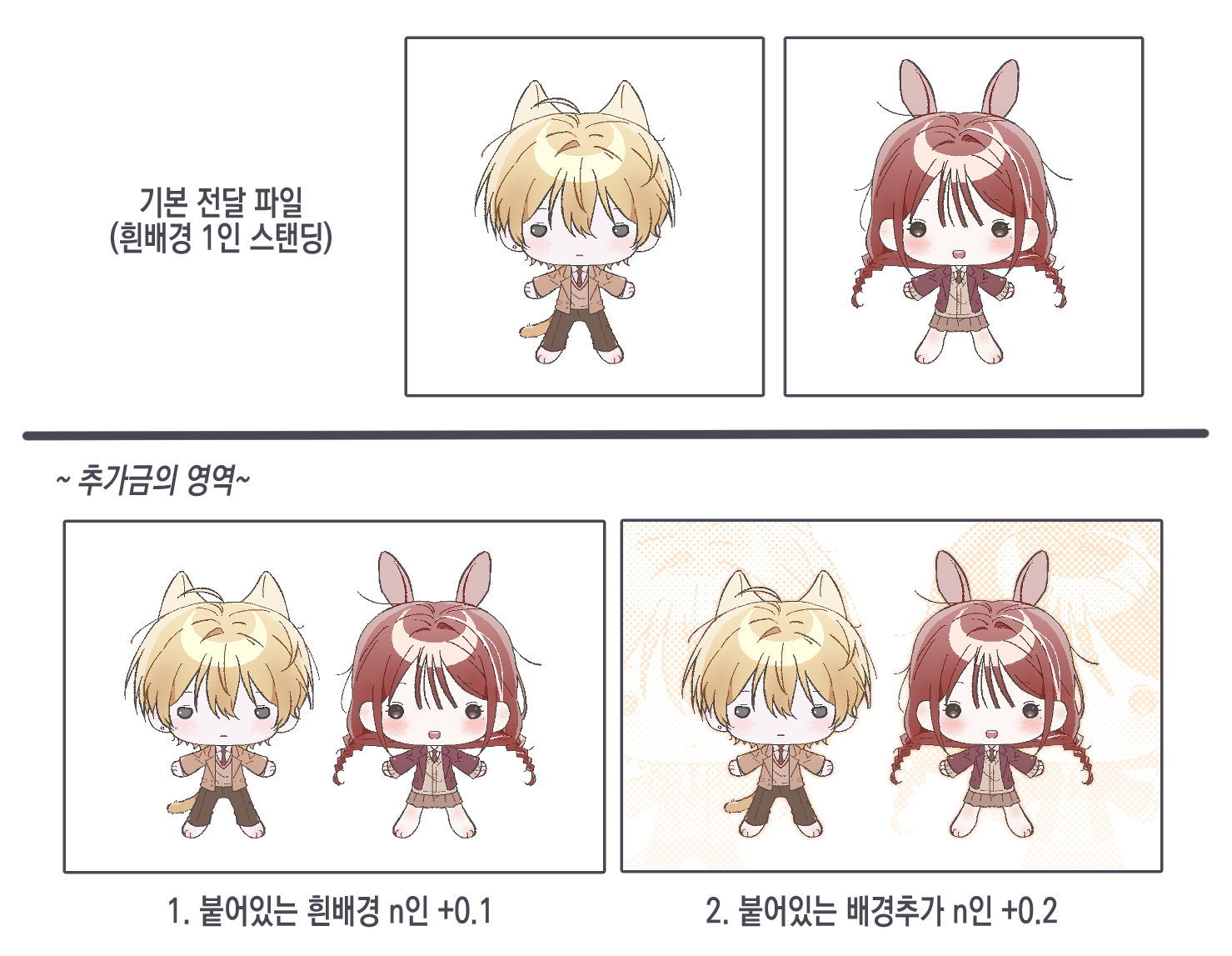 캐릭터 외관: (보내주신 순서대로 왼쪽부터 배치합니다! / 의상까지 한 번에 부탁드려요)